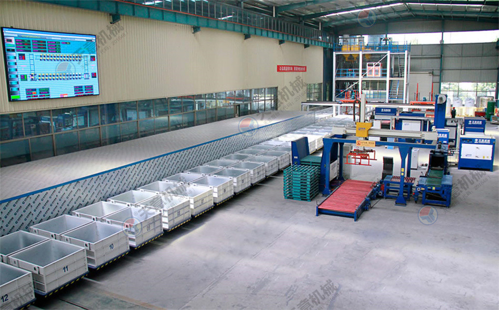 水泥發(fā)泡保溫板生產線是我公司順應市場需求新研發(fā)的成套設備。該生產線將工藝流程劃分為攪拌系統(tǒng)、循環(huán)澆注系統(tǒng)、脫模系統(tǒng)、切割系統(tǒng)、包裝系統(tǒng)、儲存系統(tǒng)、廢料破碎回收系統(tǒng),全套生產線可實現(xiàn)班產量400—600m3,全部利用自動控制生產流程,所需人工9—12人,大大降低生產成本.